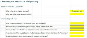 An excel spreadsheet that takes you through 17 questions (with drop-down answers) to determine whether you should incorporate your business.