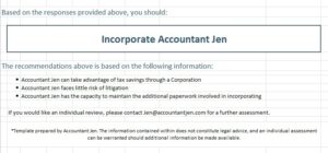 Based on your responses, you will receive individualized advice to you regarding whether or not you should incorporate and the major influencers to making that decision.